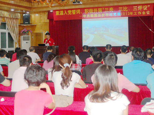 5月12日晚,“重温入党誓词,积极开展‘三亮三比三评议’——院党委2012年工作会议”在罗浮山绿芙蓉渡假轩会议室召开。院党委书记齐志儒、党委副书记杨利、副院长刘春雨和赵宇辰,以及全体党员参加大会。