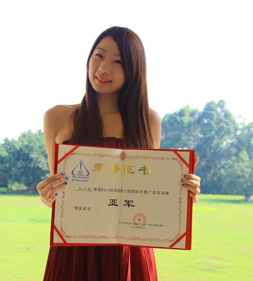 本网讯(记者 王珍)9月15日,经过激烈角逐,我院继续教育中心2012级商务英语专业蚁齐榕同学获得2012环球旅游小姐(国际)大赛广东赛区亚军。