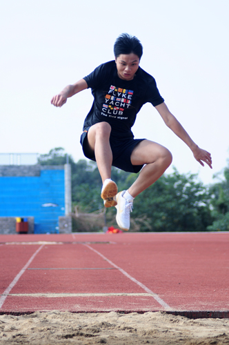 跳远比赛现场,选手似离弦的箭般助跑,起跳,空中走步,双脚同时着地,一道美丽的“弧线”就此产生。