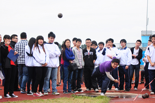 突然,观众席中一阵骚动,欢呼声高涨,原来是侯毅彬同学上场了,只见他背对草坪,双手将铅球托在肩膀上,左脚向后一蹬,随后转身,铅球便飞出一道优美的弧线。观众们显得吃惊,“哇!”有同学发出疑问,“这精彩的弧线的背后该是付出了多少汗水的训练啊!”与侯毅彬的“亲友团”在此前的预料一样, 侯毅彬以预赛第一名的成绩轻松晋级决赛,决赛阶段他势如破竹,令对手只能发出阵阵叹息,以12米56的成绩荣膺桂冠。