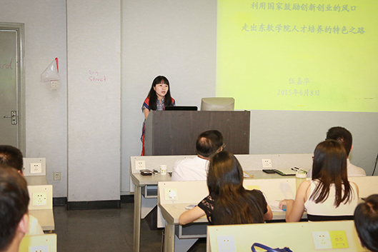 伍嘉华书记向与会人员展示了学院与高新区创业生态系统的建设宏图,分享了她参观国内具有代表性的几家创新创业孵化基地的收获和感想,她提出,学工队伍是学院人才培养的重要组成部分,辅导员老师应该结合学院培养人才计划,着重培养学生创新创业的精神,加强对学生创新创业的指导,把握好学生创新创业的话语权。